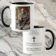 Une tasse de café mémorial qui peut être personnalisée avec la photo d'un être cher et l'histoire de sa vie. Il y a une croix noire et un poème sentimental au dos sur le fait d'être dans les bras de Dieu. Ceux-ci sont agréables à mettre lors des funérailles ou des rassemblements de célébration de la vie pour que les proches puissent les prendre.