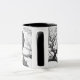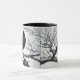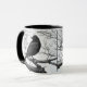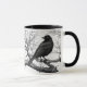 Mug in a black-and-white illustration featuring a sleek black crow perched on a gnarled, leafless branch. The bird's detailed feathers contrast sharply with the stark, skeletal tree limbs, creating a dramatic composition.