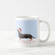 Qui n'adorerait pas cette adorable tasse de vacances ? ! ! Doté d'un mignon Dachshund noir et bronzé dans la neige, portant un chapeau de Père Noël, avec "Dachshund Through the Snow" écrit en calligraphie rouge et festive. Copyright Tuxi's Mom Designs, tous droits réservés.
