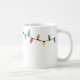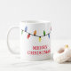La tasse à café en céramique de Noël est présentée avec un imprimé de lumières de fête avec Joyeux texte de Noël. Customisez cet objet ou achetez tel quel. Image stock