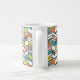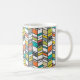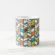 Cette tasse a un design moderne du milieu du siècle de l'épine de hareng avec des couleurs et des lignes rétro remplissant certains des espaces.
