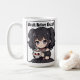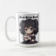 Dramatic kawaii chibi girl in goth-loli dress holding skull mug