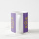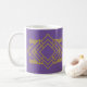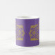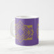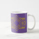 Cette tasse présente une décoration art déco composée de formes diamant et d'un rectangle, à la fois violet et or.