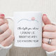 Abstrait Sun Logo Motivational Citation Coffee Mug... Le dicton de motivation sur notre tasse à café personnalisée dit : "La lumière que vous brillez sur ma vie éclaire avec chaque année qui passe" en écriture tendance et typographie sans serif classique. Une simple illustration d'un soleil rose poussiéreux sur des collines ondulées turquoises renforce le message de lumière. Ajoutez votre nom et le nom de votre autre personne importante via le modèle de personnalisation. Fait un cadeau de vacances réfléchi, cadeau d'anniversaire, ou cadeau de la Saint-Valentin. Citation originale de Barbara Casey.