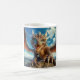 Un dragon féroce aux yeux bleus vifs et aux griffes acérées étend ses ailes large sur fond d'un ciel clair et couvert de nuages. Ses écailles sont minutieusement détaillées, et il se dresse au sommet d'un paysage de montagne rocheux.