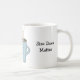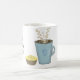 Un drôle de café qui dit sur cette tasse. Une grande tasse bleue de café chaud avec un muffin à côté. Le message dit : "Quand il s'agit de ma tasse de café, la taille importe.