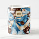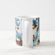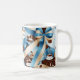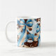 Cette tasse à café présente un design élégant et dynamique qui mêle des éléments d'inspiration café à une esthétique raffinée. L'oeuvre comprend des tasses à café vapeur, des fèves de café et des détails riches comme l'art du latte. Ces motifs sont placés contre un arrière - plan de tons bleu et or doux, donnant au design un look frais et élégant. Un grand ruban bleu décoratif aux accents dorés enveloppe le design, ajoutant une touche luxueuse. La pièce maîtresse est un monogramme encadré d'or, qui peut être customisé avec des initiales, faisant de cette tasse un cadeau personnalisé idéal ou une pièce exceptionnelle pour les amateurs de café.