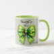 Festive Festive Verte Furry Bow-Lights Naughty ou Nice Mug. Cette tasse à thème de vacances présente un arc vert flou enveloppé de mini lumières, ajoutant une touche de fantaisie. La phrase "Naughty or Nice" est présentée, parfaite pour une ambiance saisonnière ludique. En dessous du joli arc en peluche se trouve un espace qui peut être customisé avec votre nom, ce qui en fait un accessoire festif unique ou un cadeau de Noël!