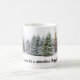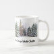 Ce mug de saison hivernale présente des arbres de forêt enneigés en arrière-plan et le texte "L'hiver n'est pas une saison, c'est une célébration. Joyeux Solstice d'Hiver. Utilisez le mug pour votre célébration et tout au long de la saison hivernale.