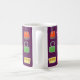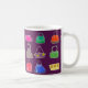 Cette tasse a un motif de sacs à main et de sacs à main dans différents styles et couleurs. Le arrière - plan est un violet foncé.