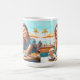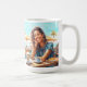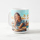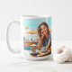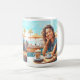 Fille souriante avec une pause café relaxante, cappuccino. Image artistique pour un séjour relaxant et amusant, avec un arrière - plan de mer ensoleillé.