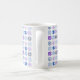 Cette tasse a une conception hivernale de différents flocons de neige en bleu et violet en rangs.
