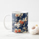 Cette jolie tasse à café présente un chiyogami japonais motif de fleurs de prune rouge et blanche sur un arrière - plan bleu foncé.