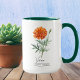 Fleur du mois de naissance Octobre Marigold mug représentant une illustration d'une fleur de marigold. Sous la fleur, le nom est écrit dans une police de script élégante. Sous le nom, il indique "Octobre - Marigold" indiquant que le mois de naissance du propriétaire est septembre et sa fleur de naissance est le gladiolus. C'est une tasse personnalisée, customisée comme un cadeau réfléchi pour quelqu'un né en octobre.