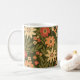 Motif floral de style rétro avec fleurs audacieuses et stylisées contre un arrière - plan vert olive foncé. Le motif est luxuriant et abondant, les fleurs paraissant flotter dans le feuillage dense. Le contraste entre les fleurs aux tons chauds et l'arrière - plan vert foncé crée un effet visuel saisissant.