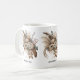 Une tasse avec un joli bouquet de fleurs de pêche, entourée de bronze brun et de feuillage aux accents de plume.