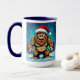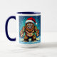 A funny Sasquatch personalized Christmas coffee mug with a comic book style pop art sasquatch smiling with a Santa and Christmas lights on.