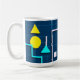 This geometric modern tech mug features a deep navy blue background with clean white lines framing a bold yellow triangle, glowing yellow circle and turquoise bottle-like shape, creating the feel of a futuristic control panel or minimalist dashboard. The simple shapes, strong color blocks and graphic layout give this abstract design a sleek, digital, design-lover vibe.