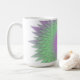 Make a bold statement with this striking geometric spiral design. Featuring layered, radiating spikes that draw the eye inward, the artwork blends soft gradients of purple and mint green against a dramatic black background. The result is a mesmerising, almost hypnotic effect that feels both modern and dynamic.