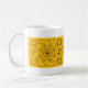 Image graphique d'une roue à eau bordée de cercles, carrés et triangles. L'image est répétée trois fois autour de la tasse et est placée sur une bande rectangle orange.