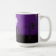 Une tasse à café éffrayante et amusante avec un design d'halloween déplaisant. Dans un cimetière sombre et effrayant. Une pierre tombale dit RIP, avec une bougie et des crânes brillants sur le sol. Une vieille clôture grinçante se penche sur le côté. Un adorable squelette souriant brille et des fantômes à l'air cool tourbillonnent dans l'air. Une chouette est assise dans l'arbre avec des yeux brillants et une lune crescente se trouve sur le côté avec des chauves-souris volant à proximité. Placez-vous sur un arrière - plan de dégradé violet.