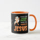 Moderne, élégant NO HOCUS POCUS Christian Halloween Jesus Mug. Le texte dit NO HOCUS POCUS LORSQUE VOUS VOUS CONCENTREZ SUR JÉSUS, dans la typographie blanche, verte et orange vif. Le design comporte un ghoul avec un X grand dessus, et en dessous il y a du TEXTE PERSONNALISABLE, qui peut être personnalisé avec votre nom ou autre texte. La référence biblique est Jean 8:32 - SI LE FILS VOUS LIBRE, VOUS ÊTES LIBRE EN EFFET. Cette tasse à café Christian Halloween ferait un grand cadeau pendant la saison d'Halloween. Choisissez parmi une large sélection de dessins de Christian Halloween par Berean Designs, spécialement créés pour les personnes de foi qui veulent célébrer une alternative à Halloween. Des cadeaux correspondants sont disponibles. Aussi en blanc.