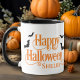 Cette mignonne tasse d'Halloween dit "Happy Halloween" dans un script décoratif orange classique avec quatre chauves-souris noires flottant à proximité. Customisez en ajoutant votre nom ou votre texte spécial.