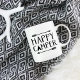 Tasses à café imprimées sur mesure avec design "Happy Camper" en noir et blanc à la mode, avec bordure de flèche tribale et graphisme teepee mignon. Utilisez les outils de conception pour ajouter votre propre texte et photos pour créer un design unique.