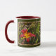 Une photo légèrement vintage d'un lis rouge et jaune avec des gouttes d'eau sur les pétales et les feuilles.