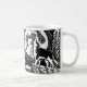 linocut rustique noir et blanc d'un husky debout sur un sommet de montagne enneigé hurlant sur la lune. Paysage scandinave avec montagnes, arbres et orignaux, et ciel étoilé au-dessus.