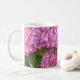Un grand tasse à café pour un jardinier ou un amoureux de la nature. De superbes hydrangées roses au feuillage vert vif accentuent cette tasse.