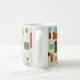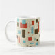 Cette tasse a un look du milieu du siècle avec un design graphique dans un carré et rectangles géométriques. Les couleurs sont bleu ciel, rouille et marron. Certains blocs sont de couleurs solides et quelques contours. Le moderne du milieu du siècle est un style qui a été populaire de 1950 à 1969. Il fait un retour en popularité aujourd'hui.