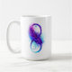 Infinity symbole with a beautiful feather painted in purple and blue bright colors on white background
