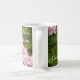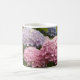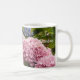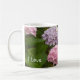D'élégantes hydrangées mettent l'accent sur cette grande tasse de café.