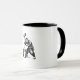 A clean, black-and-white ink illustration depicting a man performing the traditional Japanese "Mochitsuki." The artwork captures the dynamic motion of the wooden mallet (kine) being raised over the mortar (usu) to create sticky rice cakes.
