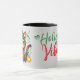 Café noir à deux tons / thé / chocolat chaud Idée cadeau Mug pour Noël. Doté d'un mignon chat portant un pull, aimez les coeurs et les baubles, avec les mots 'Vibes de vacances.' Les couleurs principales sont le vert et le rouge sur un arrière - plan gris.