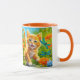 Un mignon chaton à table orange se frolant dans un jardin fleuri aux libellules colorées.