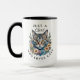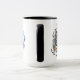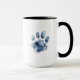 Chat blanc gris clair à l'aquarelle, entouré de fleurs rose et bleue. Le dos de tasse de café a empreinte de patte de chat avec le nom à l'intérieur.