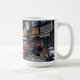 Calcutta, Inde, centre ville illustration dans un style de bande dessinée. Une tasse à café avec une illustration de la rue animée du centre-ville avec des immeubles, des restaurants, des magasins et des gens sur leurs motos.