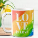 Cette Mug Gay pride est décorée avec LOVE IS LOVE dans une typographie blanche et audacieuse sur un arc-en-ciel d'aquarelle arrière - plan de rouge, orange, jaune, vert, bleu et violet. Aquarelle originale © Michele Davies.