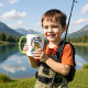 Scène fantasque d'une grenouille tenant un poteau de pêche et attrapant un poisson coloré, créant un moment de pêche non conventionnel plein d'imagination et de plaisir. Juste un enfant qui aime pêcher