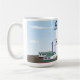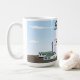 Ce dessin présente un phare blanc, vert et noir qui surplombe la mer. Le ciel est bleu avec quelques nuages. Des maisons blanches aux toits verts entourent le phare.