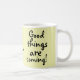 Cherchez-vous une idée de cadeau de Noël mignonne et inspirante pour quelqu'un que vous aimez? Que diriez-vous de cette adorable tasse à café couleur crème claire et positive qui dit "Les bonnes choses arrivent !" imprimée en lettres cursives mignonnes à côté d'un joli visage souriant ? Quelle façon parfaite de commencer la journée !