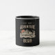 Illustration de grunge de style rétro avec texte "Let adventure begin", coucher de soleil, montagnes et décoration d'oiseaux pour tous ceux qui aiment la nature et la randonnée