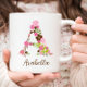 Cette jolie tasse à café personnalisée présente une lettre florale A et customisée avec votre nom dans le script de calligraphie, ou créer un cadeau unique pour vos proches.