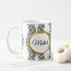 Vous pouvez facilement personnaliser ce design de tasse avec un arrière - plan zig noir et blanc avec un cercle de calligraphie parties scintillant or et le texte modèle. Remplissez les champs modèles qui changeront le nom et le texte de la lettre initiale des deux côtés.