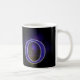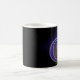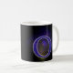 Mok avec la lettre O. (par exemple votre initiale) Amusant si votre nom commence par O ou celui de quelqu'un d'autre. Derrière la lettre se trouve une grille et des nuages mystérieux avec une lumière qui brille dessus. La lettre O est remplie d'un motif à carreaux et d'un bord gris autour. couleurs bleu, violet, jaune et noir.