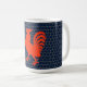 A red rooster struts across a chicken wire background on contrasting dark blue or black. Perfect for anyone who loves chickens and country-style motifs.