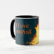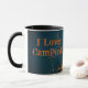Conception d'un tapis pour s'asseoir autour du feu de camp, ou feu de camp, avec un dicton personnalisé. Couleur foncée avec feu et texte orange vif. Exemple dit, "J'aime le camping", et est facile à changer. Vient dans de nombreux styles de tasse ou choisir la tasse de voyage.
