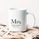 Cette tasse noire et blanche élégante et minimaliste dit "Mrs" dans une police de luxe moderne et de haute couture, et a également une place pour votre nom de famille et date mariage.